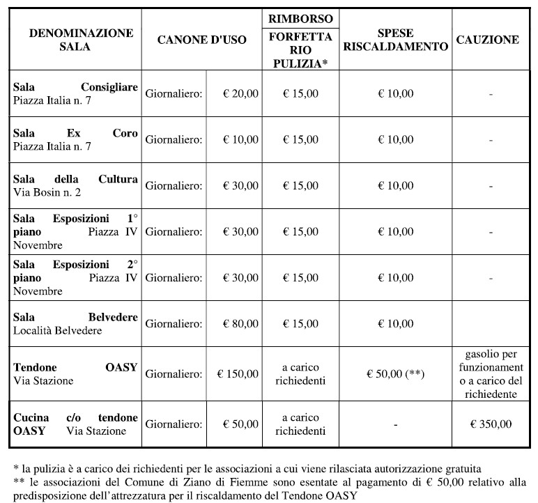 Documenti Modulo sale (File pdf 56,60 kB) Tariffe utilizzo sale delibera giuntale 86/2024 (File image/jpeg 130,16 kB)